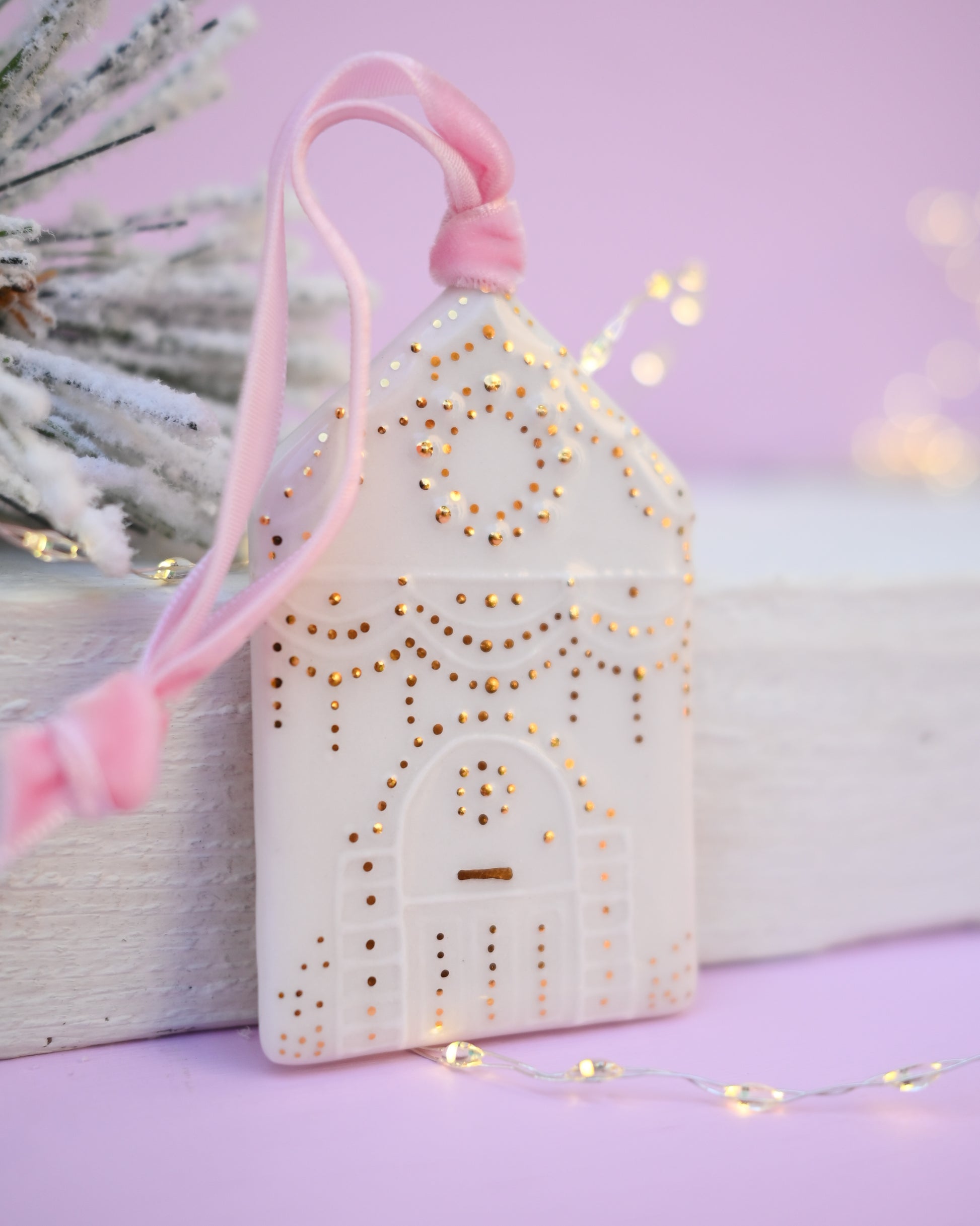 Add to your holiday ornament collection with this porcelain, hand-decorated Christmas House, 2 finished with sprinkles of 22k Gold.