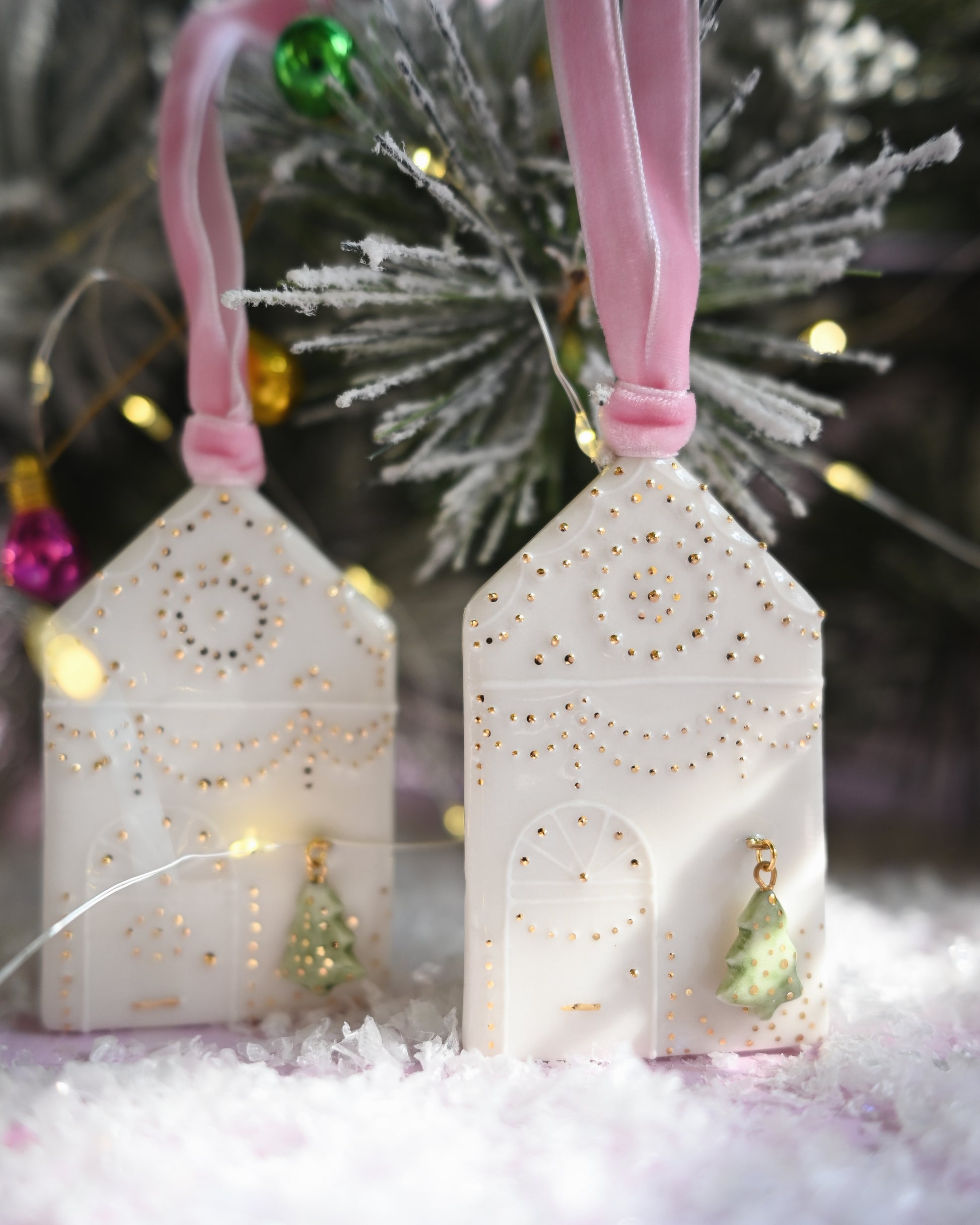 Add to your holiday ornament collection with this porcelain, hand-decorated Christmas House, with dangling christmas tree charm, finished with sprinkles of 22k Gold.