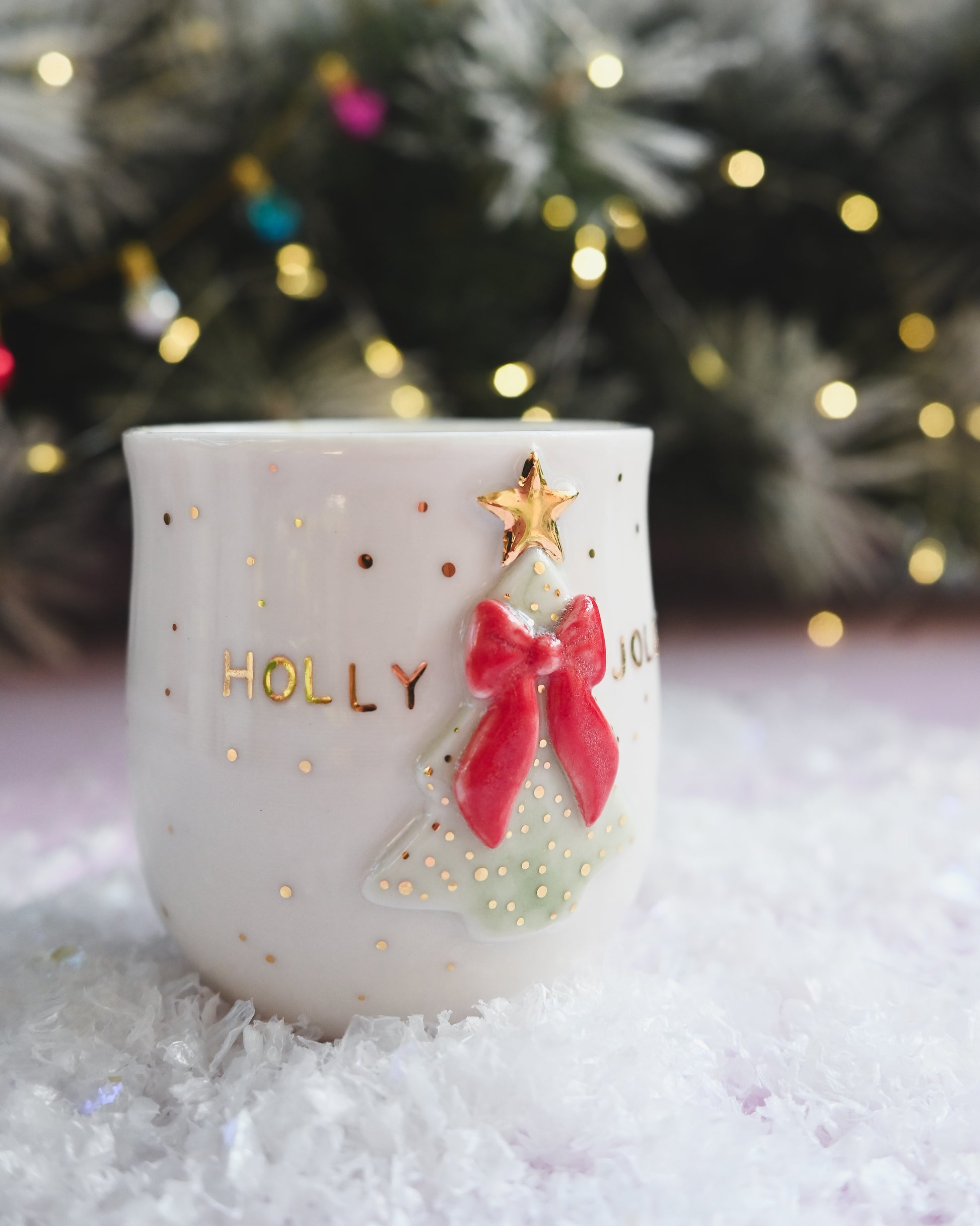 This mini special piece has been handthrown in porcelain, carefully decorated with a porcelain christmas tree and inlayed with 22k gold lettering.
