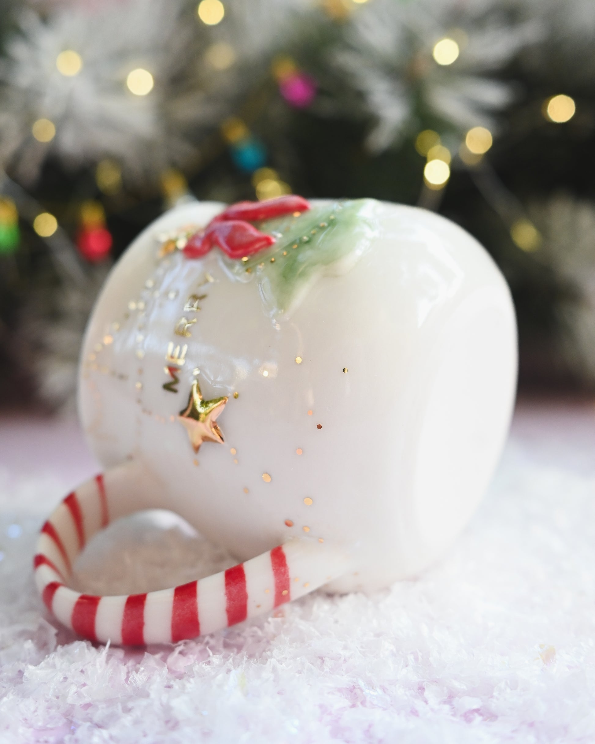 This special piece has been handthrown in porcelain, carefully decorated with a porcelain christmas tree, hand painted red & white candy cane handle, inlayed with 22k gold lettering and finished with dangling porcelain and 22k gold charms.